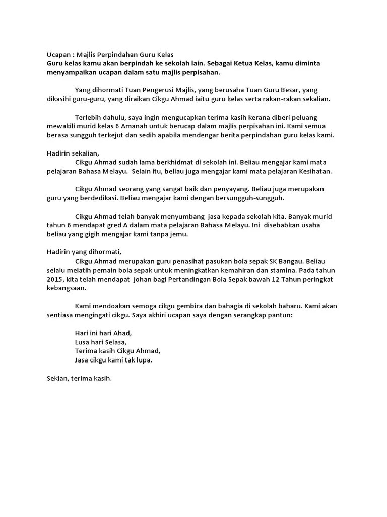 Kita itu nak berpindah berhenti kerja atau melanjutkan pelajaran ke luar negara. Ucapan an guru kelas yang akan berpindah ke sekolah lain ucapan majlis perpisahan guru berpindah ide contoh karangan ucapan ucapan . Bila tak bisa menyampaikan secara langsung ucapan ini bisa dikirim melalui media sosial. Contoh kata perpisahan untuk guru. Alhamdulillah, bersyukur kita kehadrat ilahi kerana dengan limpah kurnianya dapat kita berkumpul pada hari ini di majlis perpisahan saya yang . Berikut terdapat 10 contoh pidato atau sambutan perpisahan, mulai dari pidato perpisahan sekolah, kelas 6, kelas 12, guru dan karyawan lengkap.